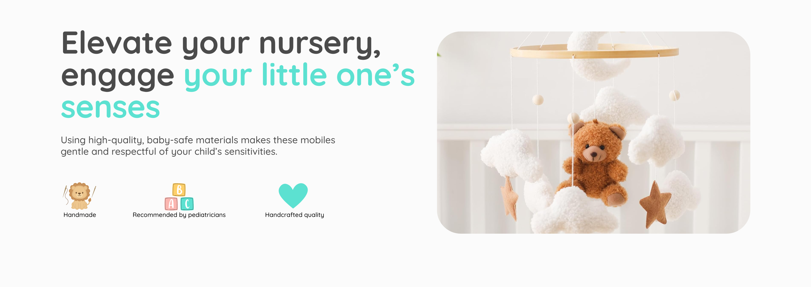 Behind every mobile we create are hours of research, design, and passion. Each mobile is built around a beechwood ring, filled with hypoallergenic stuffing and baby-safe textiles carefully chosen for their safety. The meticulous assembly, crafted by hand with precision, and create a soothing sensory world that respects your baby’s sensitivity.