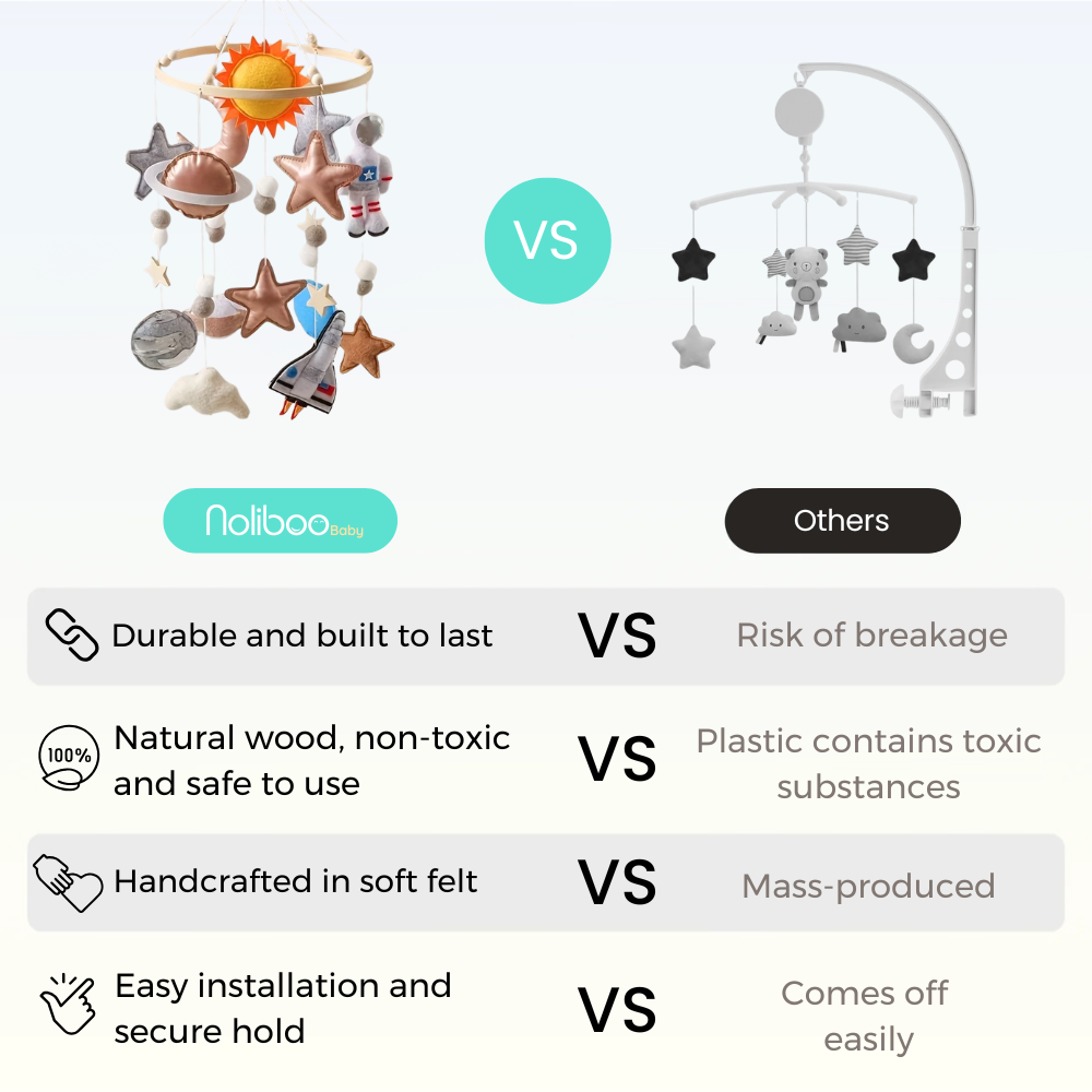 While most mobiles are often made of plastic or lower-quality materials, a Noliboobaby mobile is handcrafted in felt with meticulous details, making it soft, beautiful, and truly unique.