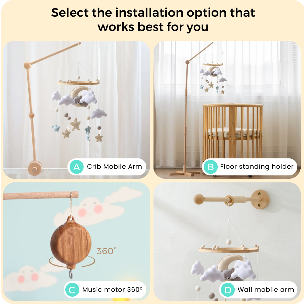 Noliboobaby mobile can be safely installed from the ceiling or paired with our natural beechwood arms (sold separately). Designed for safe and secure installation, it’s perfect for creating a soft, soothing atmosphere in your baby’s nursery.