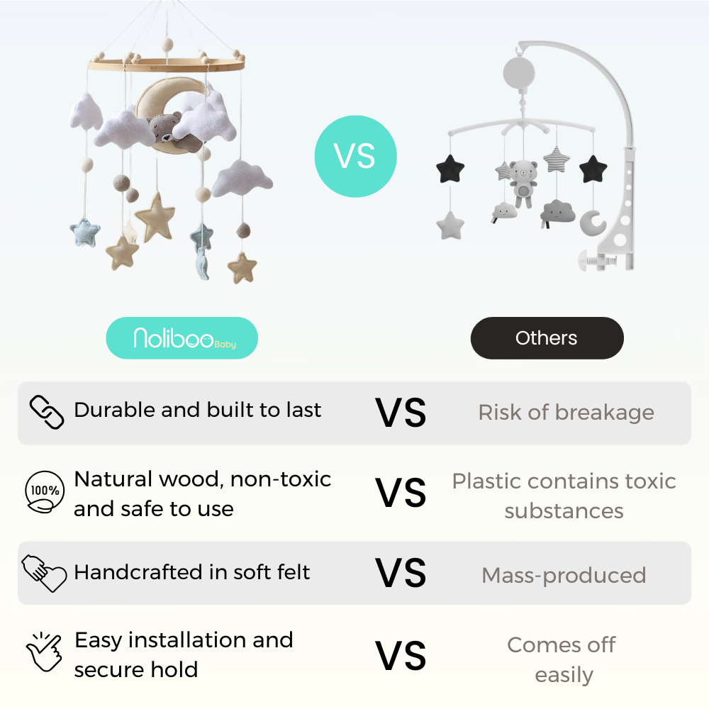 While most mobiles are often made of plastic or lower-quality materials, a Noliboobaby mobile is handcrafted in felt with meticulous details, making it soft, beautiful, and truly unique.