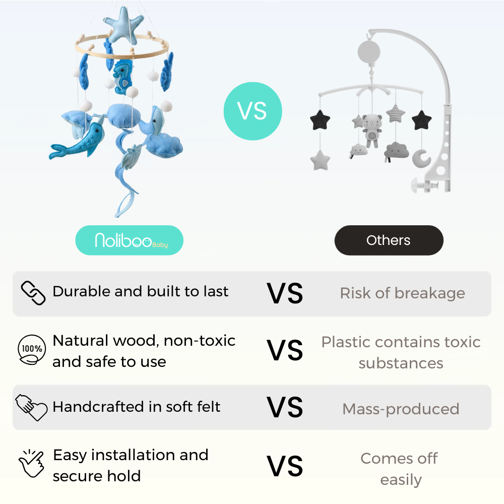 While most mobiles are often made of plastic or lower-quality materials, a Noliboobaby mobile is handcrafted in felt with meticulous details, making it soft, beautiful, and truly unique.