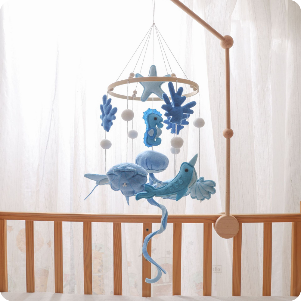 If the mobile hangs too low, you can shorten the string that attaches it to the mount. On certain models, such as Blue Ocean or Under the Sea, you can also reduce the length of the jellyfish tentacles by simply trimming the felt.