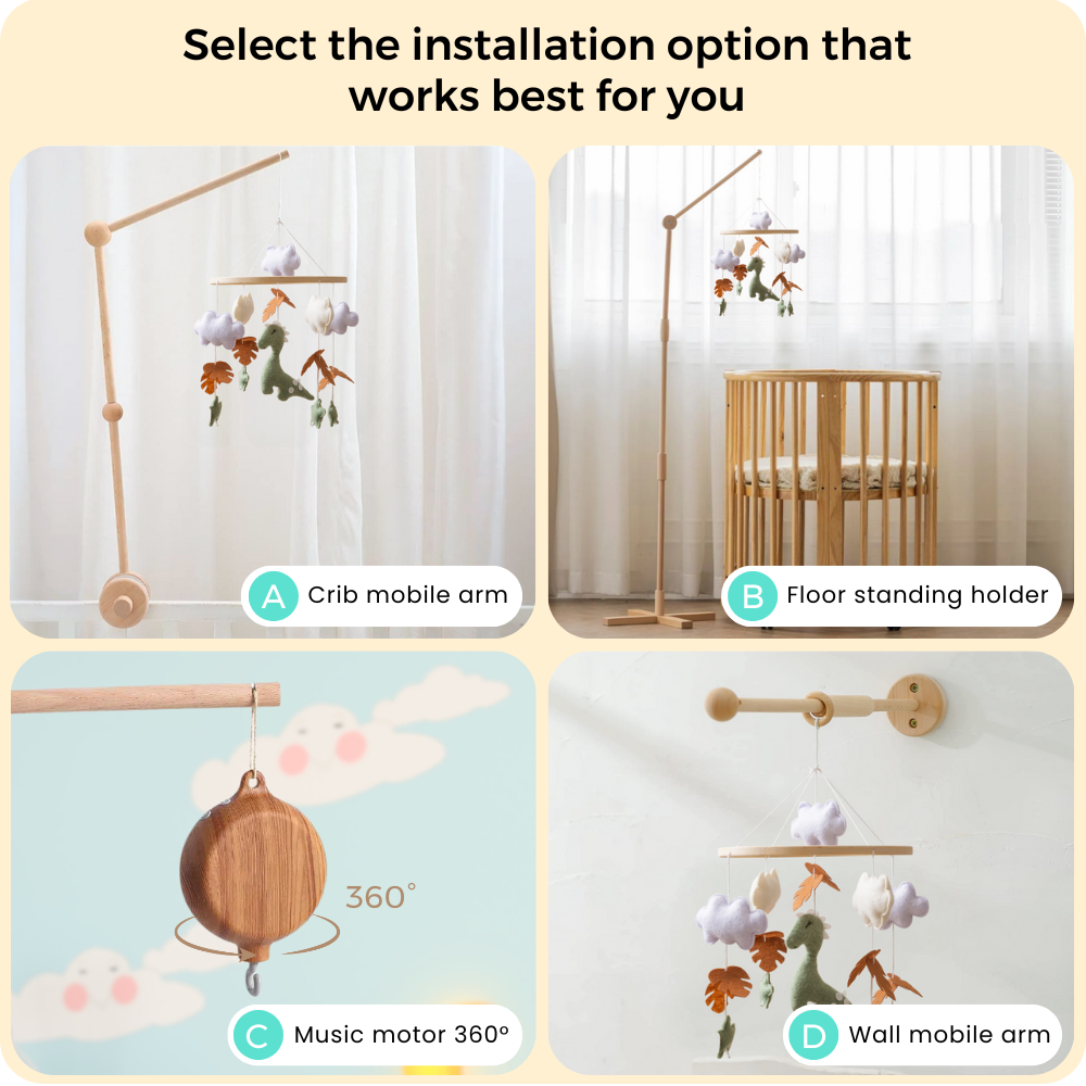 Noliboobaby mobile can be safely installed from the ceiling or paired with our natural beechwood arms (sold separately). Designed for safe and secure installation, it’s perfect for creating a soft, soothing atmosphere in your baby’s nursery.