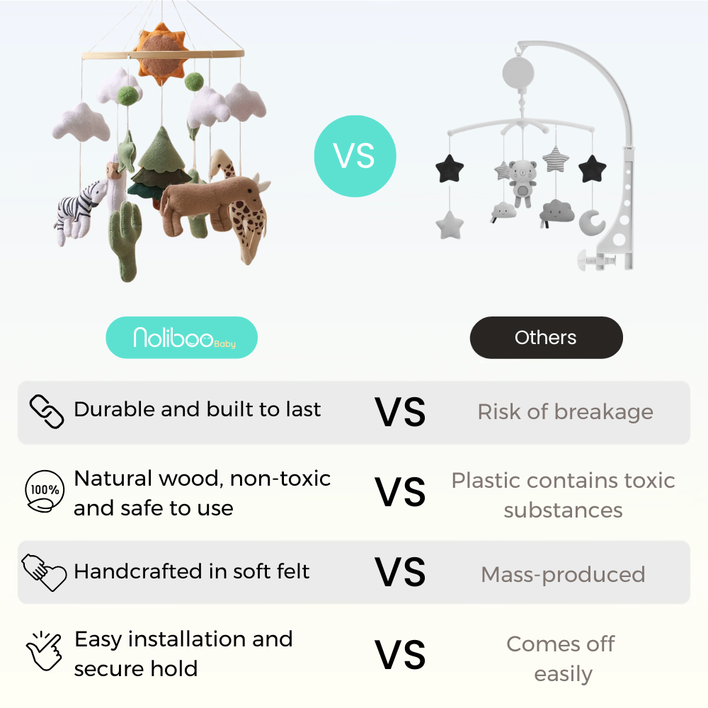 Every moment your baby spends watching the Noliboobaby mobile is a time of active learning and growth. By visually tracking the different elements, your baby strengthens eye muscles and develops spatial awareness, skills that will later support crawling, walking and even reading.