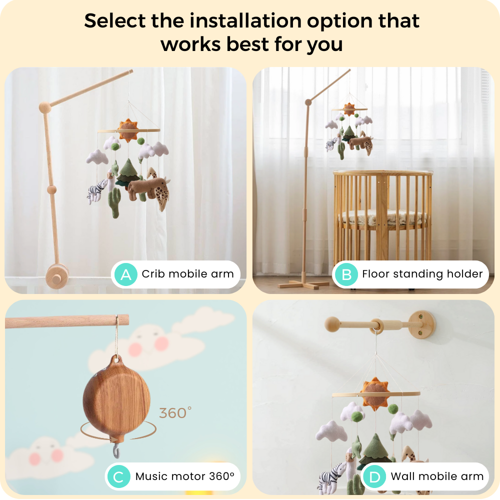 Noliboobaby mobile can be safely installed from the ceiling or paired with our natural beechwood arms (sold separately). Designed for safe and secure installation, it’s perfect for creating a soft, soothing atmosphere in your baby’s nursery.