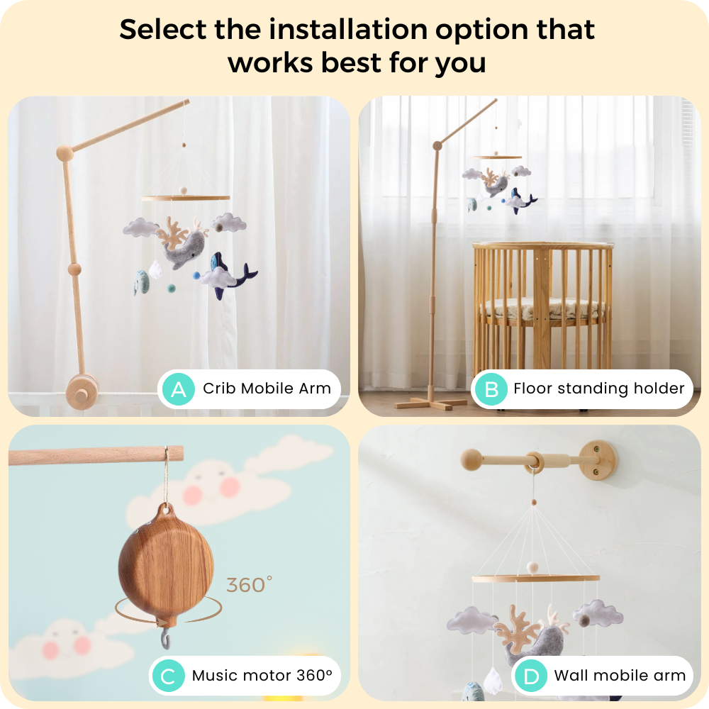 Noliboobaby mobile can be safely installed from the ceiling or paired with our natural beechwood arms (sold separately). Designed for safe and secure installation, it’s perfect for creating a soft, soothing atmosphere in your baby’s nursery.