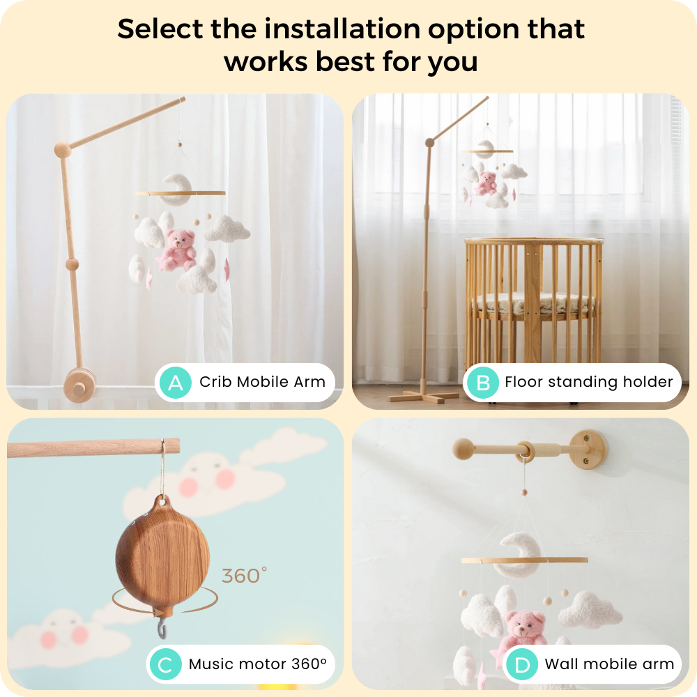 Noliboobaby mobile can be safely installed from the ceiling or paired with our natural beechwood arms (sold separately). Designed for safe and secure installation, it’s perfect for creating a soft, soothing atmosphere in your baby’s nursery.