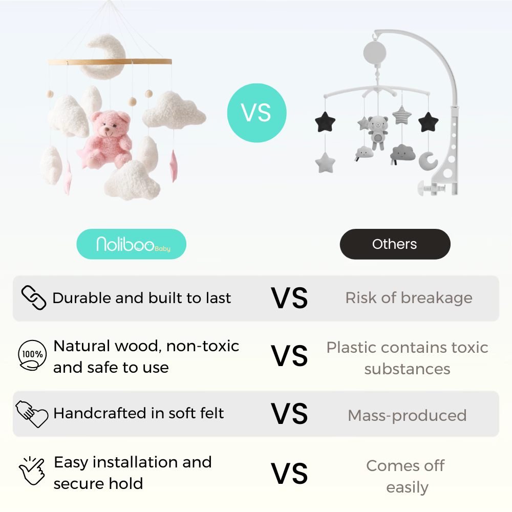 While most mobiles are often made of plastic or lower-quality materials, a Noliboobaby mobile is handcrafted in felt with meticulous details, making it soft, beautiful, and truly unique.