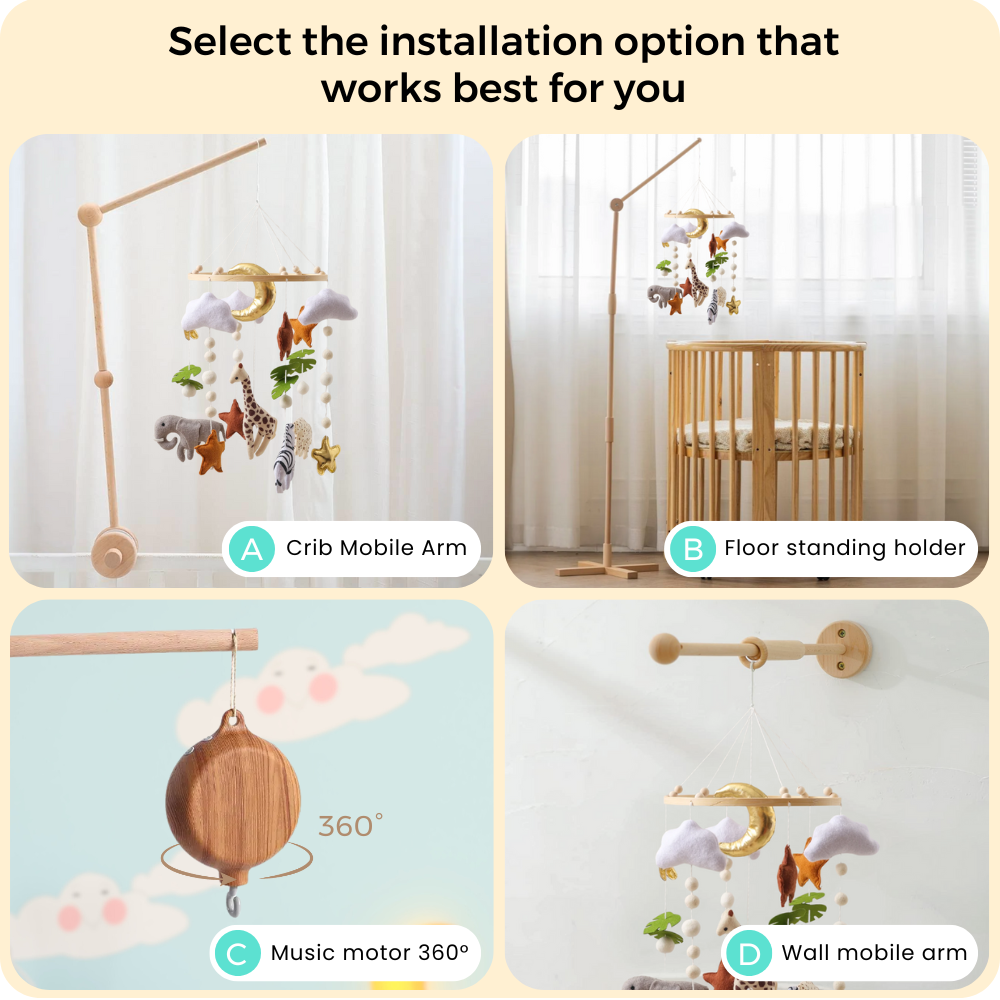 Noliboobaby mobile can be safely installed from the ceiling or paired with our natural beechwood arms (sold separately). Designed for safe and secure installation, it’s perfect for creating a soft, soothing atmosphere in your baby’s nursery.