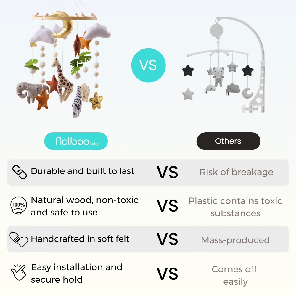 While most mobiles are often made of plastic or lower-quality materials, a Noliboobaby mobile is handcrafted in felt with meticulous details, making it soft, beautiful, and truly unique.