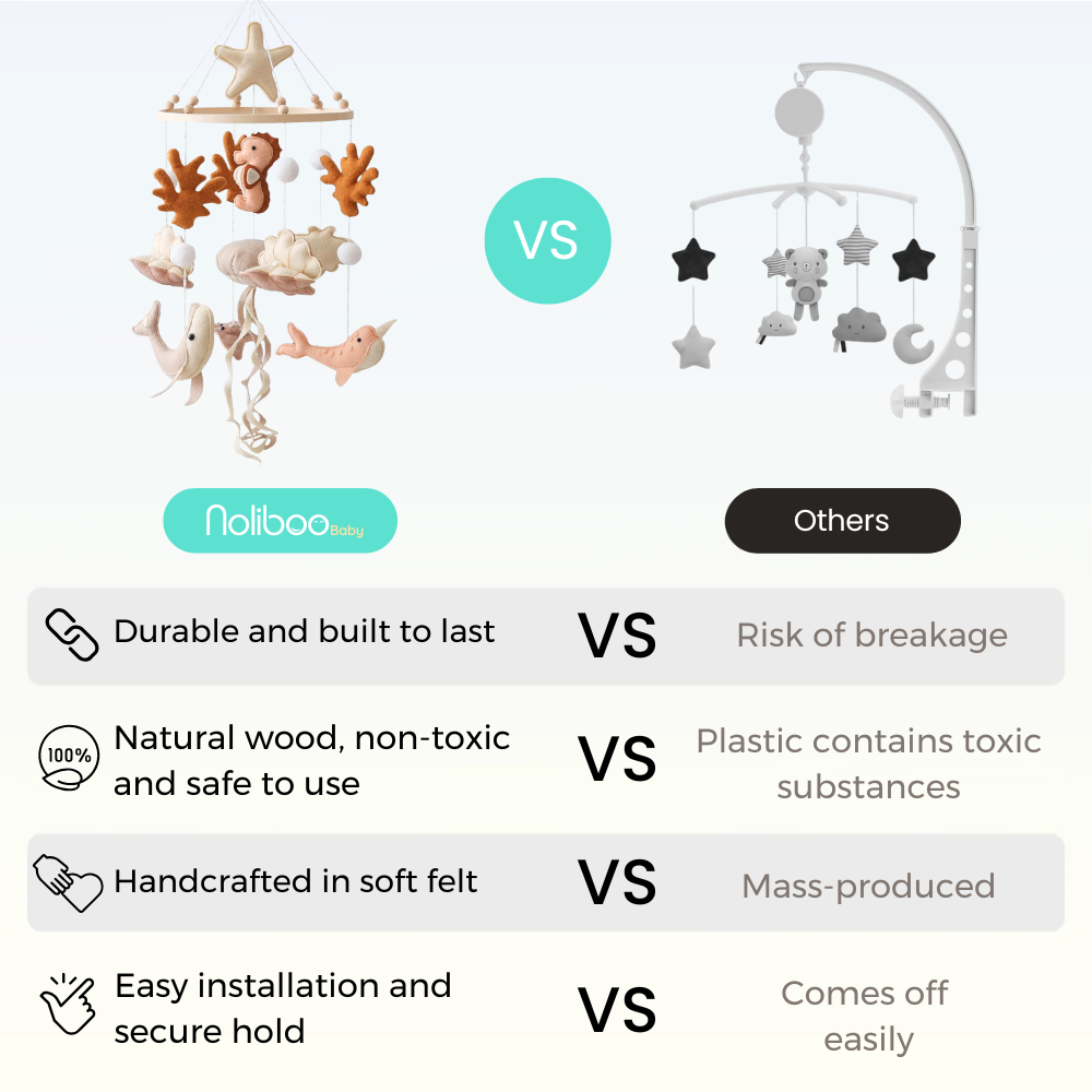 While most mobiles are often made of plastic or lower-quality materials, a Noliboobaby mobile is handcrafted in felt with meticulous details, making it soft, beautiful, and truly unique.