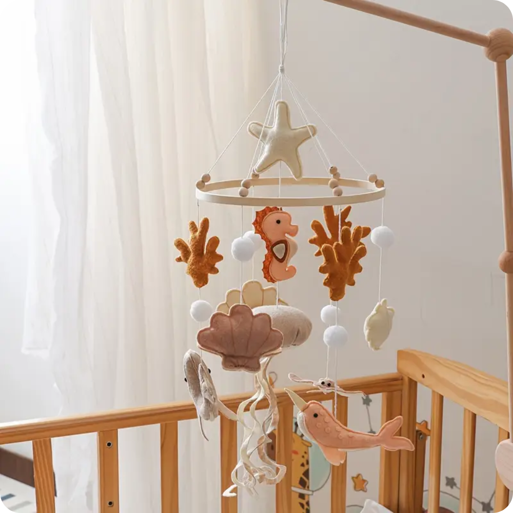 Every moment your baby spends watching the Noliboobaby mobile is a time of active learning and growth. By visually tracking the different elements, your baby strengthens eye muscles and develops spatial awareness, skills that will later support crawling, walking and even reading.
