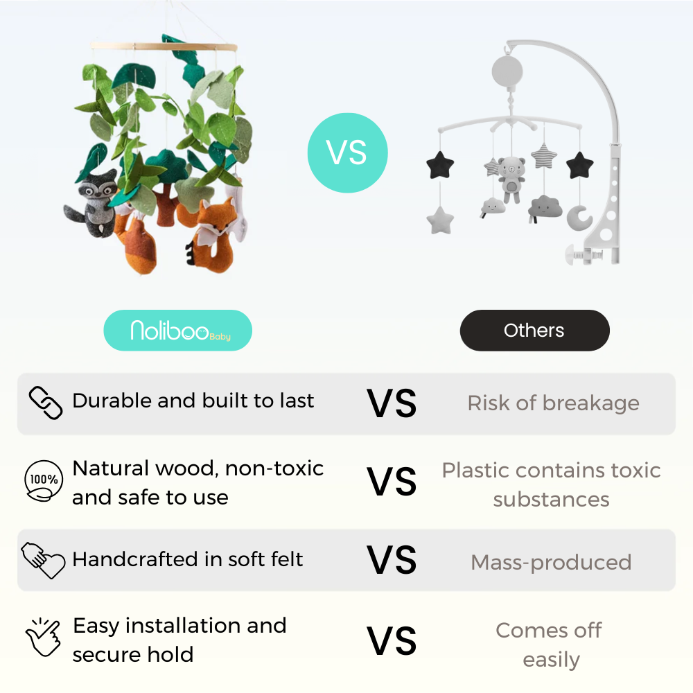 While most mobiles are often made of plastic or lower-quality materials, a Noliboobaby mobile is handcrafted in felt with meticulous details, making it soft, beautiful, and truly unique.