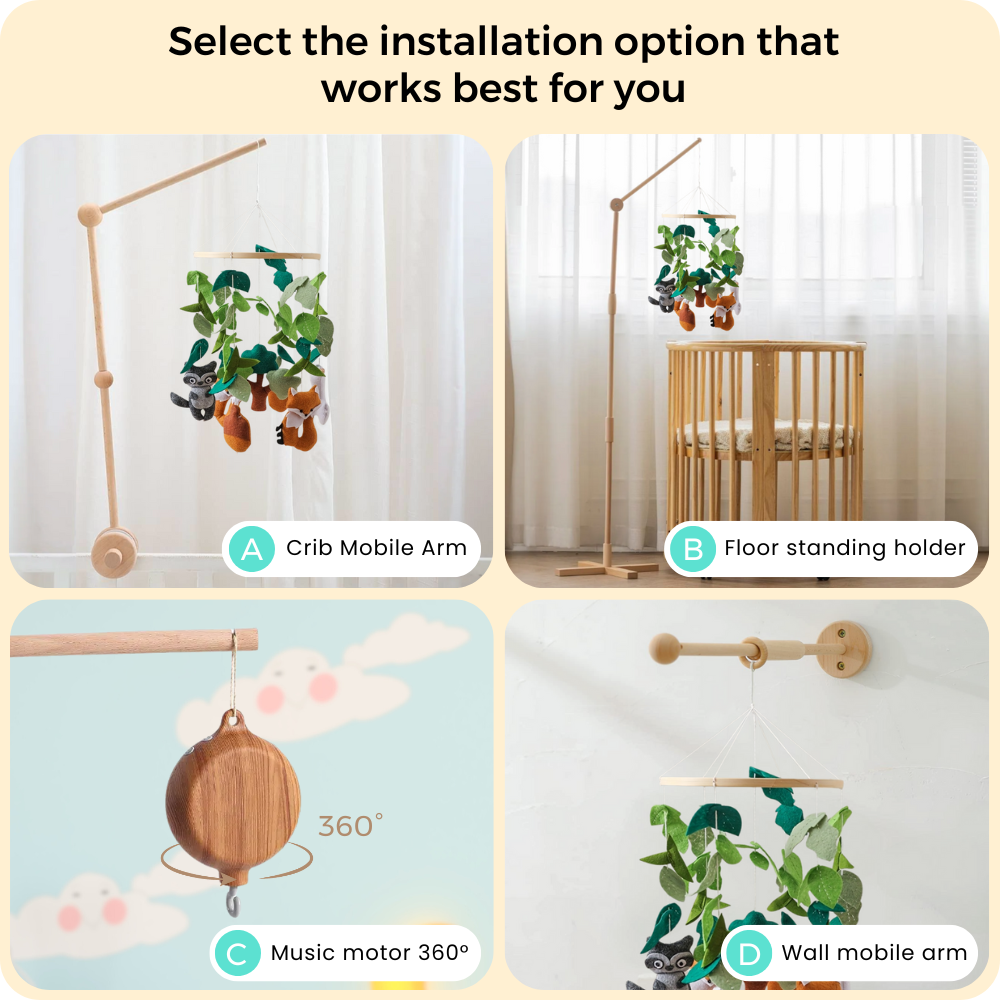 Noliboobaby mobile can be safely installed from the ceiling or paired with our natural beechwood arms (sold separately). Designed for safe and secure installation, it’s perfect for creating a soft, soothing atmosphere in your baby’s nursery.