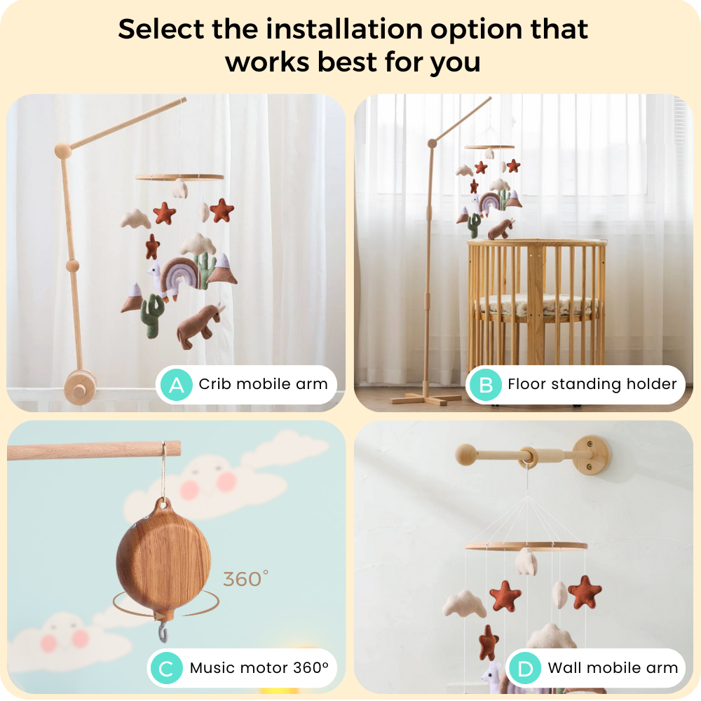 Noliboobaby mobile can be safely installed from the ceiling or paired with our natural beechwood arms (sold separately). Designed for safe and secure installation, it’s perfect for creating a soft, soothing atmosphere in your baby’s nursery.