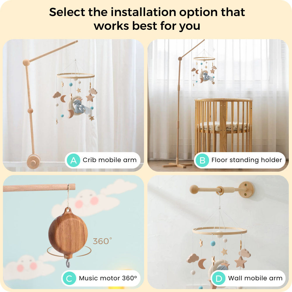 Noliboobaby mobile can be safely installed from the ceiling or paired with our natural beechwood arms (sold separately). Designed for safe and secure installation, it’s perfect for creating a soft, soothing atmosphere in your baby’s nursery.