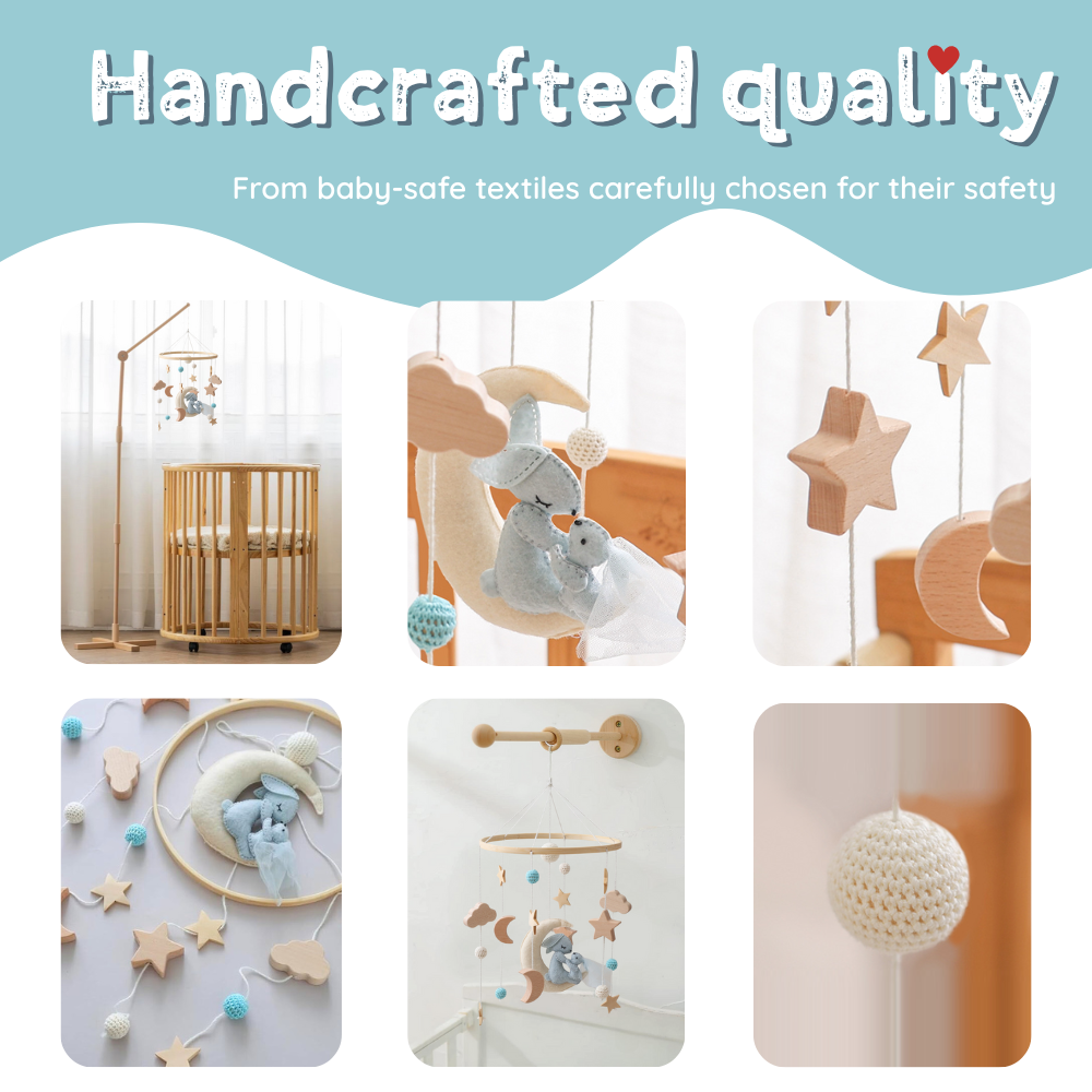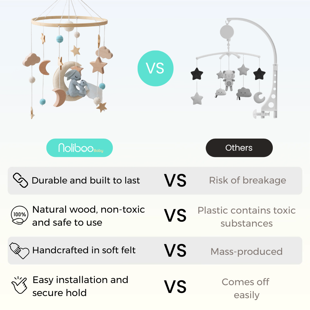 While most mobiles are often made of plastic or lower-quality materials, a Noliboobaby mobile is handcrafted in felt with meticulous details, making it soft, beautiful, and truly unique.