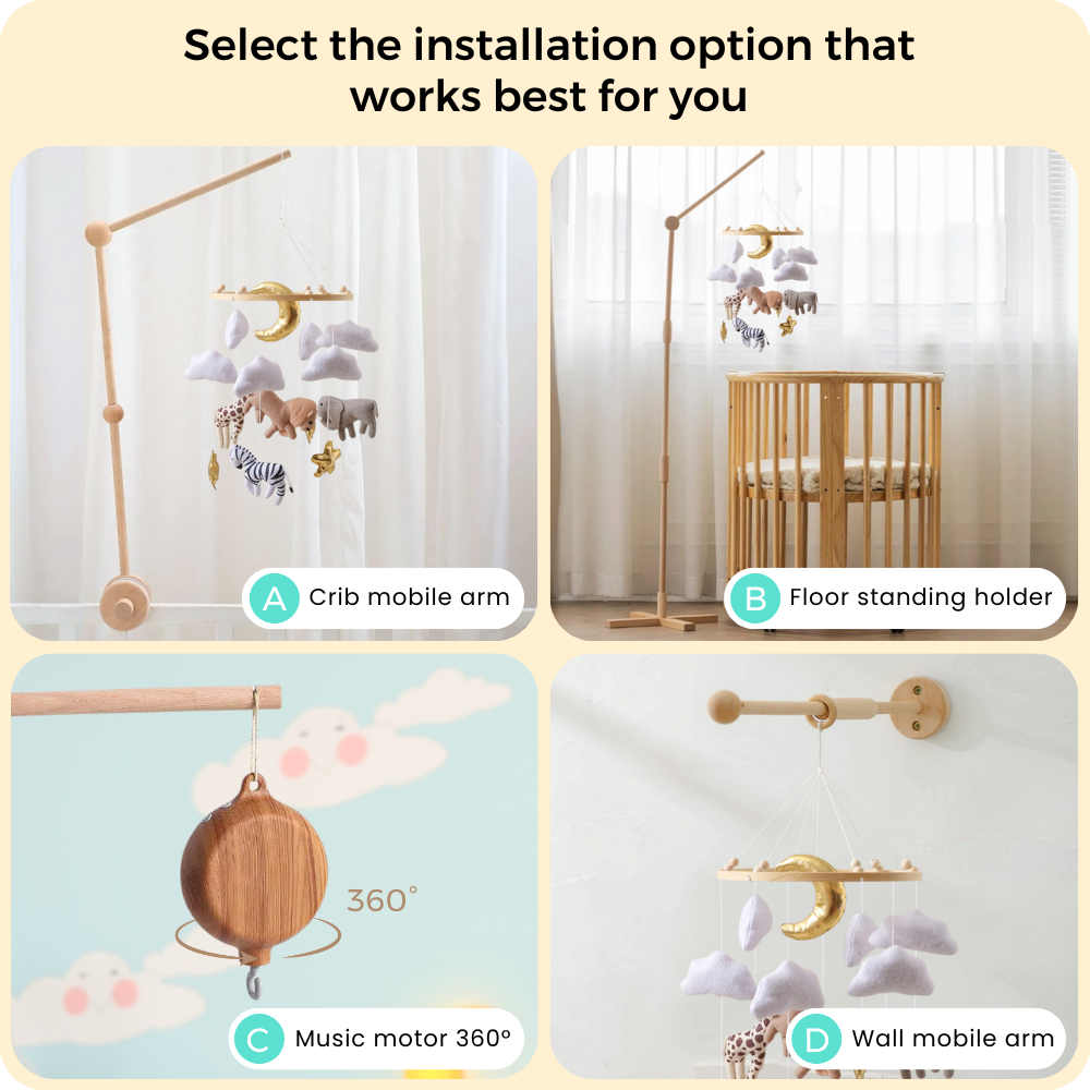 Noliboobaby mobile can be safely installed from the ceiling or paired with our natural beechwood arms (sold separately). Designed for safe and secure installation, it’s perfect for creating a soft, soothing atmosphere in your baby’s nursery.