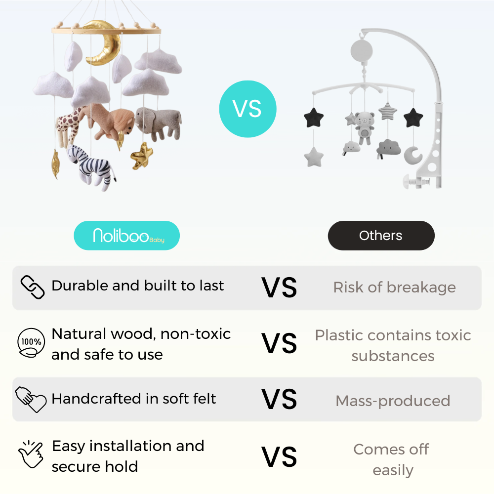 While most mobiles are often made of plastic or lower-quality materials, a Noliboobaby mobile is handcrafted in felt with meticulous details, making it soft, beautiful, and truly unique.