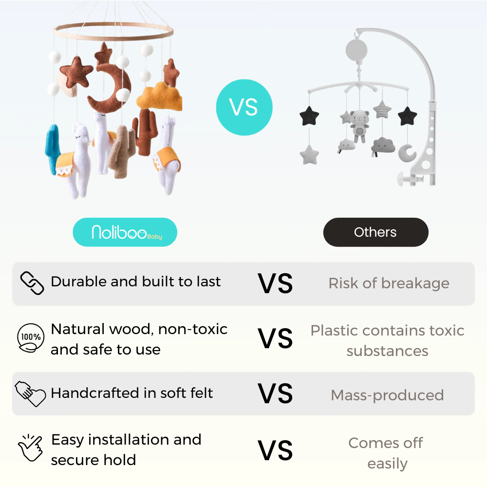 While most mobiles are often made of plastic or lower-quality materials, a Noliboobaby mobile is handcrafted in felt with meticulous details, making it soft, beautiful, and truly unique.