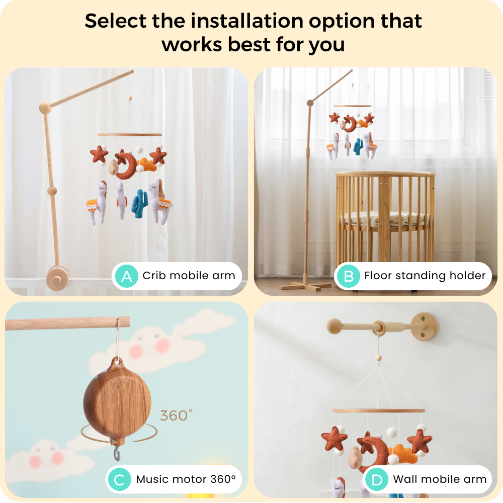 Noliboobaby mobile can be safely installed from the ceiling or paired with our natural beechwood arms (sold separately). Designed for safe and secure installation, it’s perfect for creating a soft, soothing atmosphere in your baby’s nursery.