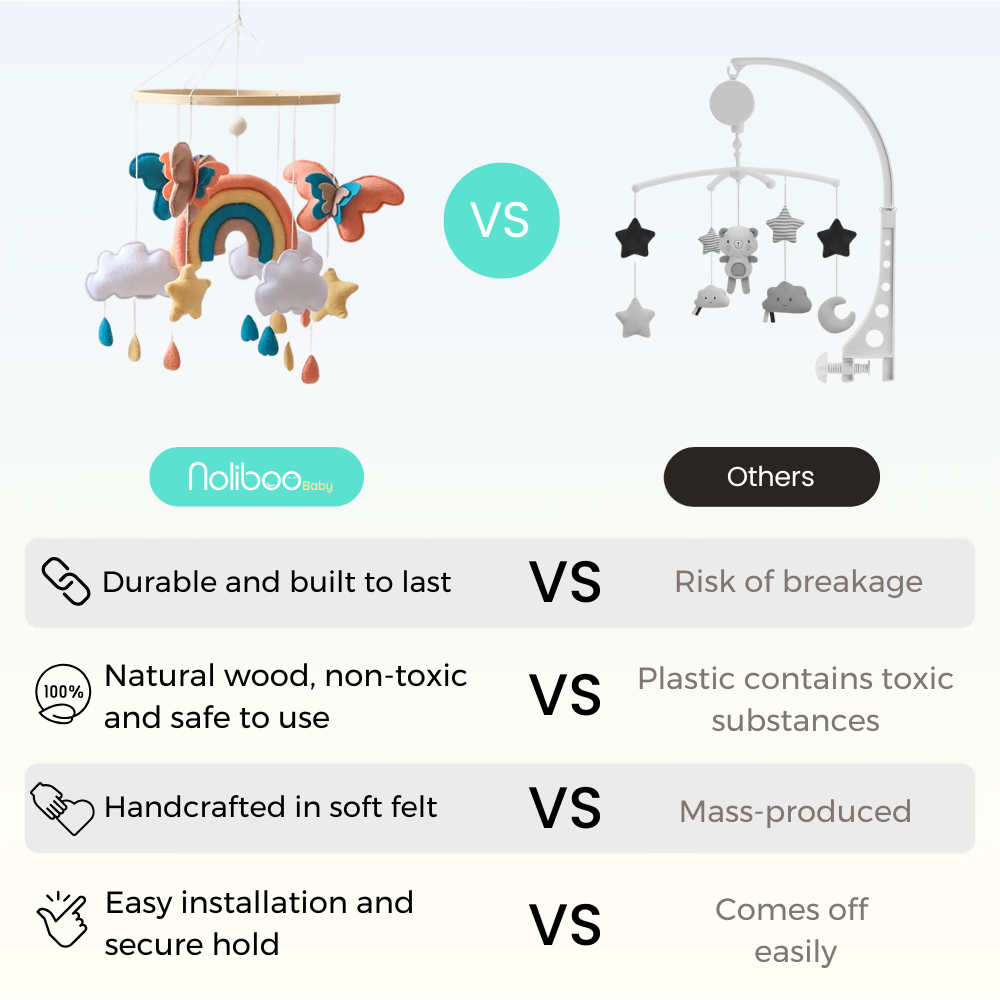 While most mobiles are often made of plastic or lower-quality materials, a Noliboobaby mobile is handcrafted in felt with meticulous details, making it soft, beautiful, and truly unique.