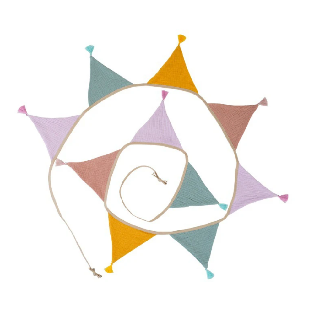 Add a soft decorative touch to your baby’s room, playroom, or birthday party with our cotton pennant garland. This minimalist garland is made of hand-crafted cotton flags in a soothing shade, offering an elegant and timeless accent to any child’s space.